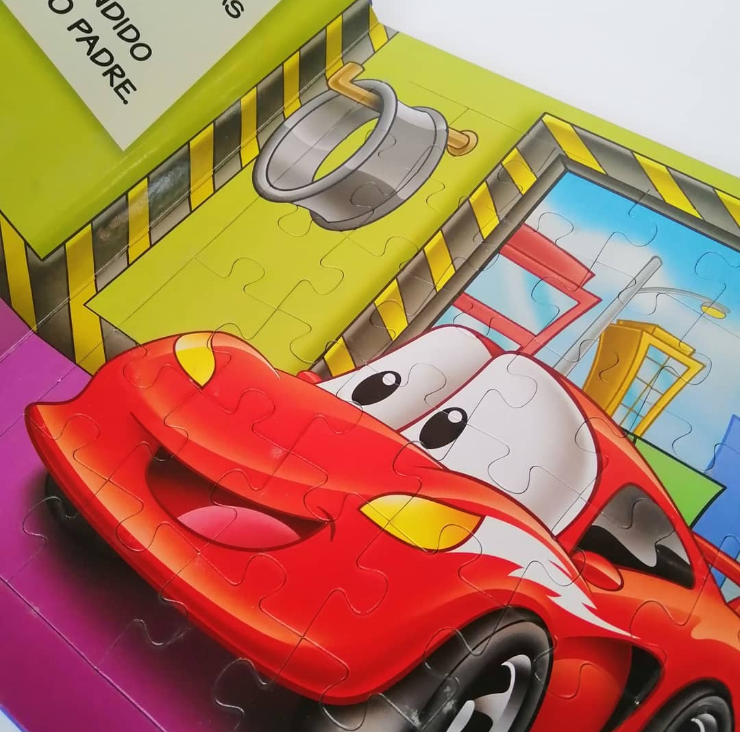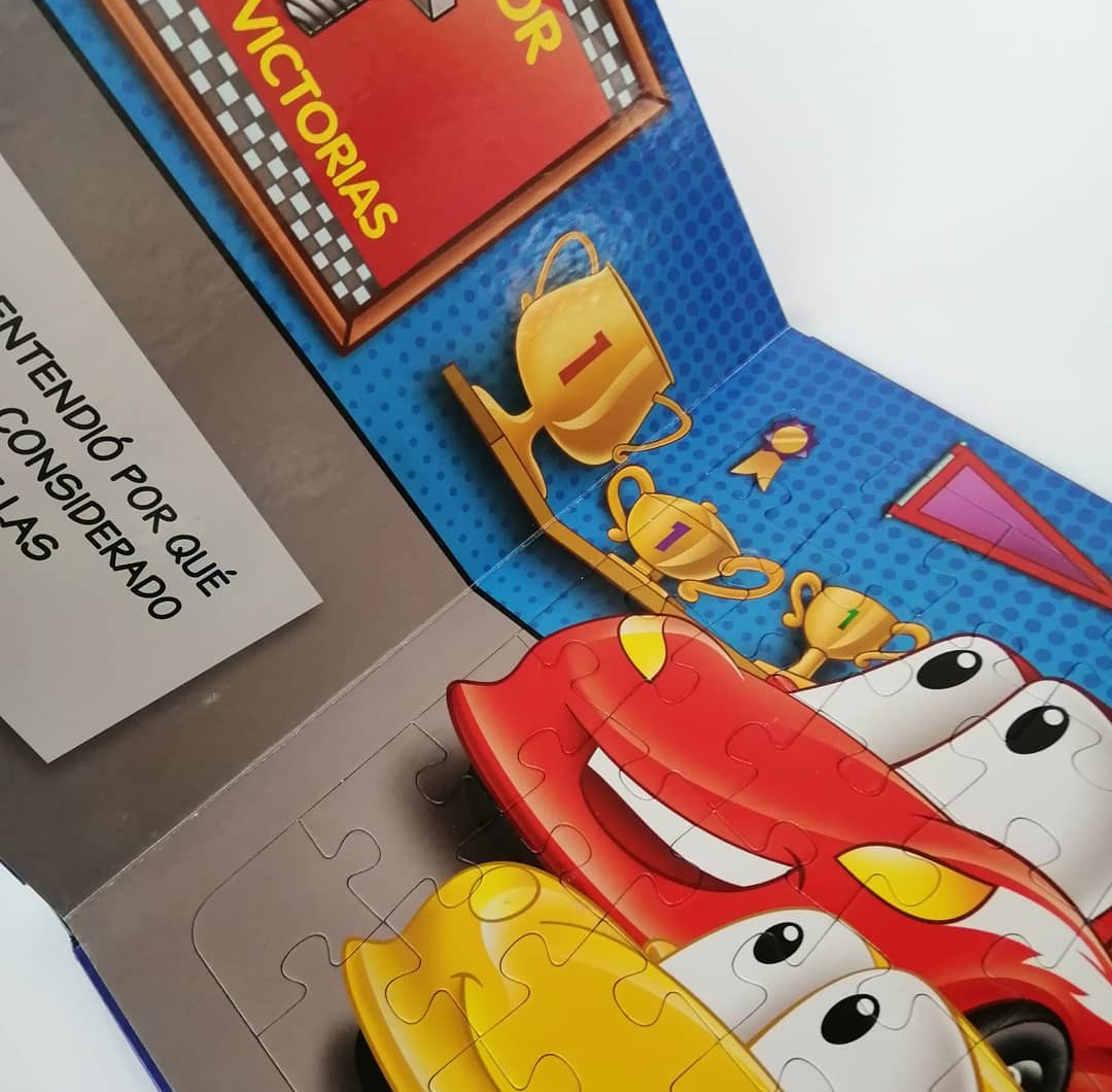 Libro de tapa dura. Una figura en 3D en la portada. 4 Hojas de cartón grueso brillante. Incluye 4 rompecabezas. Ilustraciones a toda hoja full color