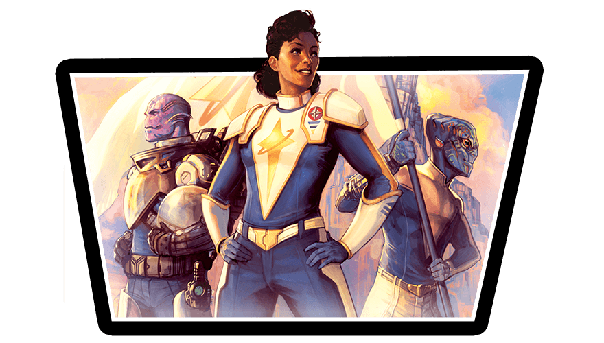 La Alianza Estelar ha pasado décadas explorando la galaxia e incorporando decenas de sistemas estelares a su pacífica y democrática Alianza. Desde que se estrelló, la tripulación de la Alianza ha construido una pequeña ciudad donde su comunidad políglota compuesta por multitud de especies de los diversos sistemas de su civilización ha logrado medrar. Trajeron consigo tecnología avanzada, incluidos sofisticados ordenadores, mochilas retropropulsoras, pistolas de rayos y los omnipresentes módulos de muñeca que conectan a cada miembro de la tripulación con la computadora central de la Quantum. Por su parte, la Capitana Val Jericó (Mundos en Colisión, 326) y su tripulación están encantados de poder reclutar guías nativos como parte de los preparativos para seguir descifrando los misterios del universo.