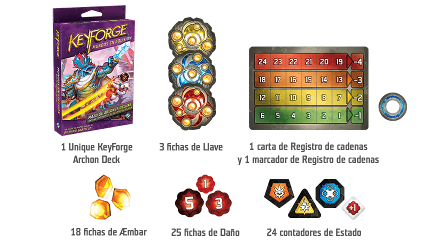 Sin embargo, tanto si estás descubriendo el Crisol por ti mismo, lanzándote a probarlo en un impulso, o simplemente necesitas más fichas, ahora podrás hacerte con el Mazo de Arconte deluxe de KeyForge: Mundos en Colisión. Esta caja es el primer paso perfecto para adentrarse en el primer juego de mazos únicos del mundo, ya que incluye todas las herramientas que un solo jugador necesita para comenzar o continuar con sus aventuras en el Crisol, incluidos un Mazo de Arconte de Mundos en Colisión único, un Reglamento de inicio rápido, un Registro de cadenas, tres Llaves y todas las fichas necesarias para comenzar tus choques cósmicos.