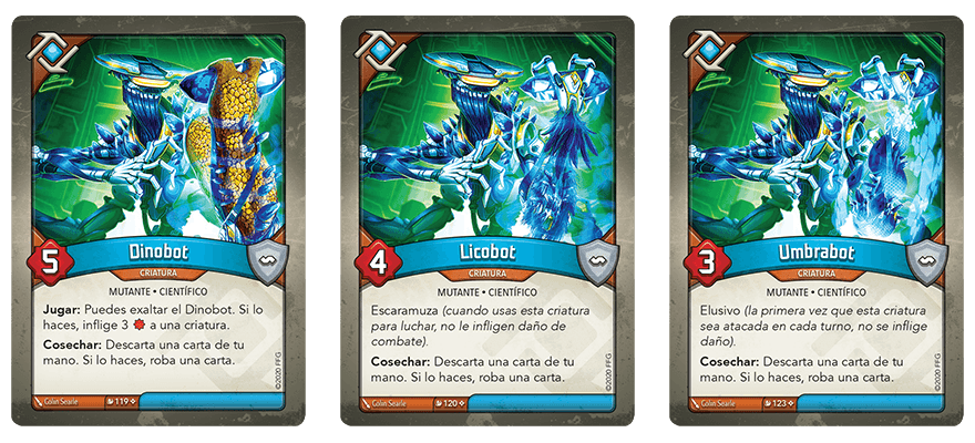 De otras criaturas te puedes encontrar múltiples versiones, ya que las mutaciones hacen que las casas de tu mazo se acerquen más que nunca. Por ejemplo, en Casa Logos puedes encontrarte con un Dinobot (Mutación Masiva, 119), que presenta aspectos del estilo de juego tanto de República Sauria como de Logos. Pero también hay un Licobot (Mutación Masiva, 120), un Umbrabot (Mutación Masiva, 123) y otras variantes de este mismo tipo de criatura para cada una de las Casas.