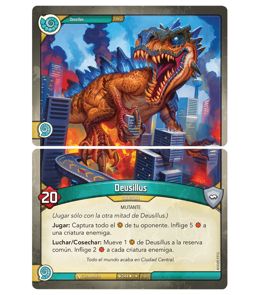 Cada una de las criaturas gigantescas de Mutación Masiva se extiende a lo largo de dos cartas de tu mazo, y necesitarás ambas cartas en tu mano para poder jugar con la criatura. Sin embargo esta dificultad se verá bien recompensada como podrás comprobar con el imponente Deusillus (Mutación Masiva, 244). Esta criatura de 20 de Poder captura todos los Æmbar de tu adversario e inflige 5 de Daño a una criatura enemiga cuando entra en juego, y cada vez que lucha o cosecha, ¡descarta 1 Æmbar e inflige 2 de Daño a cada criatura enemiga!